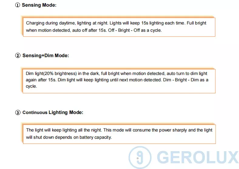Розроблений з професійним датчиком PIR, автоматичним освітленням людським зондуванням тіла. Використання інтелектуального ІС Система управління для забезпечення безпеки під час зарядки, розряду та транспортування. Усунути небезпеку пошкодження акумуляторів і навіть вибух, спричинений перевищенням-Завантажений або більше-виписаний. Продукт суворо в Відповідність з водонепроникною конструкцією IP65, безпечною та практичною