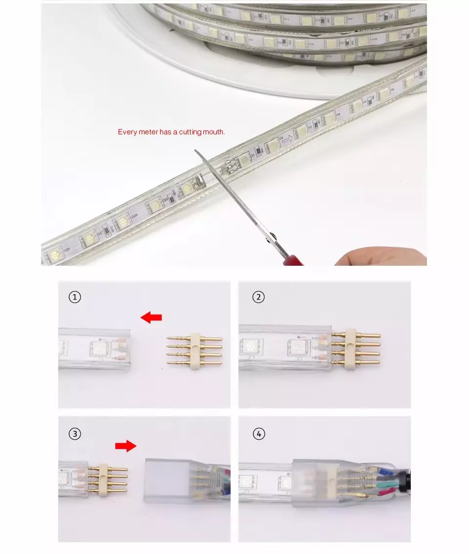 Item Name: AC 220V LED Strip Light LED Chip: SMD5050 Voltage: AC220V LED Quantity: 60LED/M Beam Angle: 120° Waterproof: IP65/IP67 Size: (H)6mm x (W)13mm Cuttable every 1 meter along the cutting marks Long Life: Over 50000hrs Warranty: 2 years