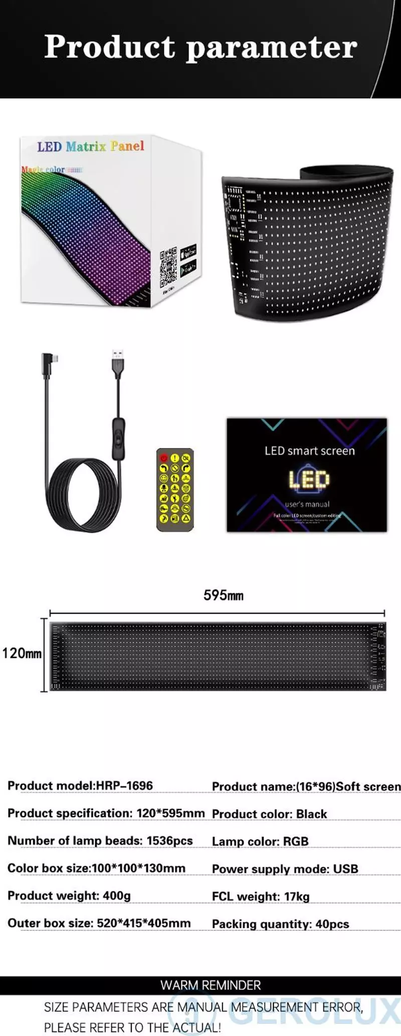16*96 Pixel=1536 Lights Product size :12*59.5cm Product inches:23.42x4.72in power:5V2A 10W 4.5m USB cable Colorful effect APP control with remote control Wireless Bluetooth connection Material:PU+FPCB IP65 waterproof